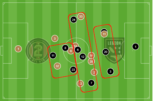 In this graphic the Legion is in gold, playing from left to right. Bruno Lapa is hidden under the OKC #8 (confusingly also Bruno’s number). As you can see, I’ve grouped the team into three boxes, which makes the setup look as if it;s a 3-4-3 rather than a 3-5-2. More on that in a moment. Now look at the formation against Atlanta: