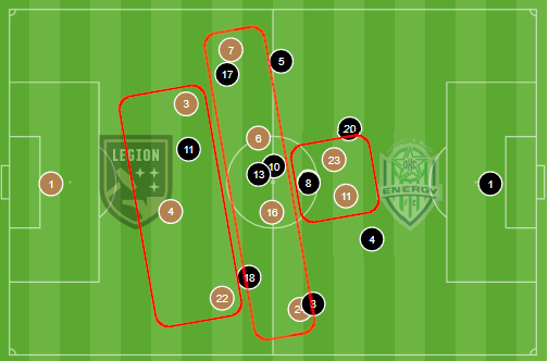 This was also the second outing for the newly adopted 3-5-2 formation and this definitely looks like the way of the future for the Legion. This time around it was slightly different. For a start, Freddy Kleemann was recalled by Austin FC and had to be replaced. Alex Crognale was still not ready to start (although he made a very welcome cameo appearance after the goal), so Zach Herivaux was plugged in as the middle centerback. Eli Crognale started in place of Daigo Kobayashi, and switched places with Anderson Asiedu. But despite those changes the actual usage of the formation was remarkably consistent. Here are the average positions for the midweek game against OKC Energy: