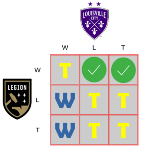 The results on the outside represent the possible finishes in this weekend’s games; inside the grid is what the Legion will need to do in each scenario. The good news is that there are only two circumstances in which a win is needed.