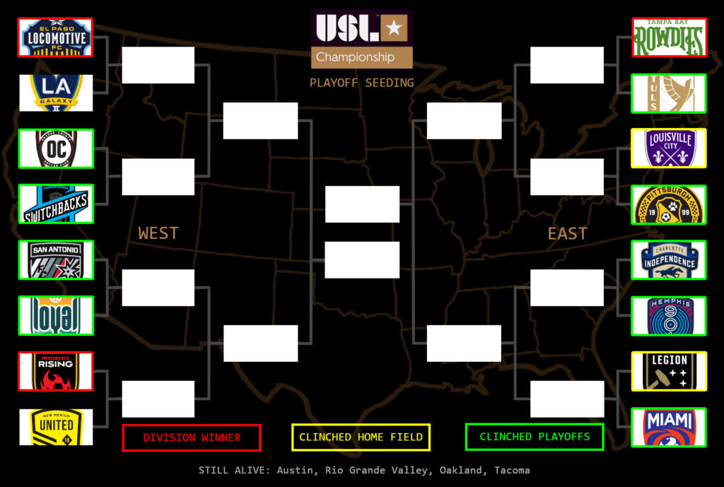 The three vying for 4th place are New Mexico United, Austin and Rio Grande Valley. New Mexico is on 43 points, the other two on 41. RGV have 2 games remaining, though, so anything is possible. New Mexico plays Real Monarchs, Austin plays Charlotte, and RGV plays at Real Monarchs and then hosts El Paso. RGV would take it with 2 wins regardless of results by the other two teams.