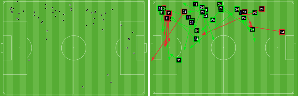 On the left are the combined touches of Jonny and Marlon throughout the first half, playing right to left. By my count there are 52 touches. Of those 35 are wide of the penalty area. And 30 of them are in the attacking half. Of the attacking touches, 24 are out wide and another couple are not far off that. The right graphic shows what they did with the ball. Lots of crosses. A ton of crosses even. And that doesn’t even get into the incredible overlapping play the two of them executed repeatedly. A thing of beauty it was. Not only that, but it was definitely the playing style we need to see from the Three Sparks. More of this please, lots more.