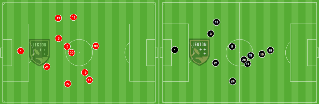 Anyway, what this shows is the average positions of the Legion starting XI in both games. On the left is the Memphis game, Phoenix on the right. Both games are playing left to right. As far as the Phoenix game is concerned, it looks like the attack was very concentrated in the middle, when the reality is the team played pretty wide. But remember that Prosper (#10) and Marlon (#11) switched flanks at half time. On average, then, they played very centrally; in reality they were out wide. Adjust for that and it’s a pretty organized 4-2-3-1. Not only that but it’s spread out nicely. A pretty aggressive game plan, all told.
