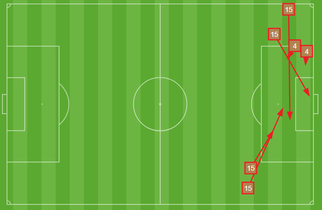 You can at least see that the formation was consistent – Smith (#4) looks relatively central, but remember he switched flanks. Totally compressed. Another indication of how things went is Ando’s passing chart:
