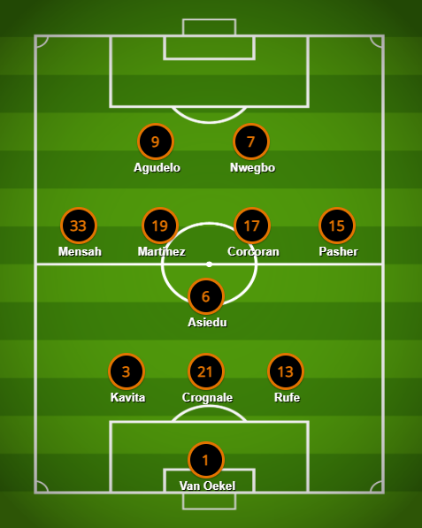 My player selections, however, are probably the most debatable part of this. Clearly, I have gone with youth. In a big way. I spent some time criticizing Mensah, but I’m starting him over Prosper Kasim in the wingback slot I think fits him best. Prosper doesn’t possess much in the way of defensive credentials and he is notoriously one-footed; Moses does not appear to have either of those problems. I’ve also picked Matthew Corcoran; they don’t come much younger than him. But he has already proven himself mature beyond his years and he is not easily intimidated. I mulled a bit over flipping him and Ando, and in fact that could probably be done comfortably in-game, After all, they have been playing much of the time as a double pivot. The final contentious choice is starting Diba over Neco Brett. Neither of them scored in this game, but I think with a full 90 minutes or at least 70 Diba would have been a murderous threat. Pairing him with Juan would cause all sorts of defensive nightmares.