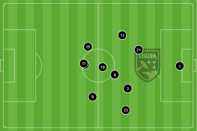 It shouldn’t be too difficult for a team that is used to a 4-2-3-1 to adapt to this formation. The two systems have one big point of convergence: the midfield triangle (also part of a 4-3-3). In the initial lineup it is of course inverted in a 3-1-4-2, but that does not mean it lacks the rotation capacity that any other triangle-based setup utilizes. The rotating triangle concept is useful in that can rapidly adapt from a defensive alignment to an attacking one. It is ruthlessly coached at virtually every academy and should be an ingrained part of any midfielder’s skill set. The Legion already uses it all the time.