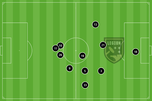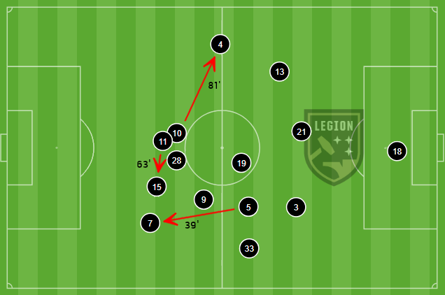 The final substitution was ostensibly a defensive one late to park the bus. But look how high Collin Smith (#4) ended up playing. Pretty much a wingback, which is what he really is. His presence kept the play to the left where the Legion had been in control all night already, but also a 5th back as needed.