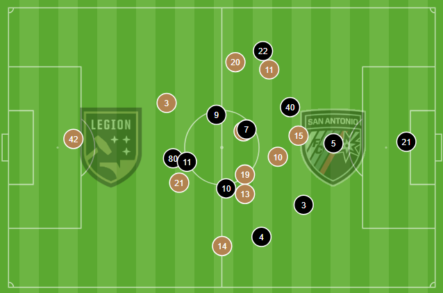 The formation was a very cynical 5-3-1-1. To their credit though, they did at least make attempts early in the game. The only San Antonio shot from inside the Legion 18 was in the tenth minute (by Kendall Burks, a defender). It went wide. The only shot on target they managed all game was also in the first half, but it was a long-range lob from 10 yards inside his own half by Mitchell Taintor (also a defender) that gave Legion keeper Jayden Hibbert absolutely no problems. Five shots in the second half were all off target and mostly by very wide margins. They finished the game with 0.51 xG.