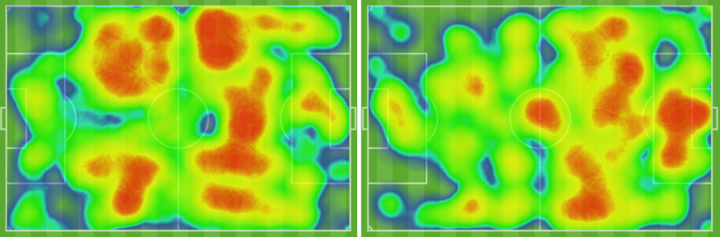 Another way to see how much more the Legion pressed its attack in the second half is provided by the heatmaps. Here are the heatmaps for the two halves: