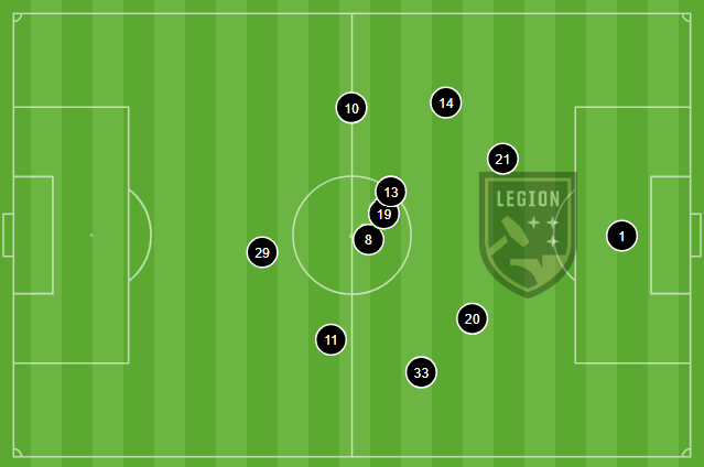 All that being said, the 4-5-1 was actually maintained in a fairly disciplined manner. Here are the Legion’s average positions for the starting XI: