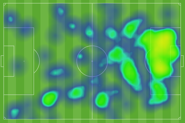 Evidently, after the Legion went down a man, the original tactics more or less went out the window. Even though the Legion had well under half the possession prior to the ejection, it got worse afterwards. But playing a man short when you are leading is different than when you are level or trailing. That is, you can afford to give up possession so long as you are able to defend. But in this case the Three Sparks were lacking both their regular starting centerbacks in Phanny and Alex. A third centerback was on the pitch in AJ, and Jake can also serve in that role admirably. Good. Time to bunker. Here is the Legion heatmap after the red card:
