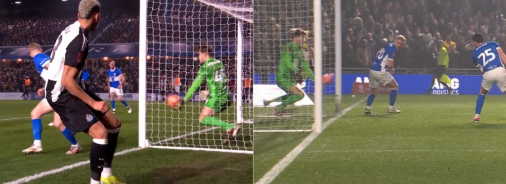 Bear in mind that the FA Cup does not have VAR, so there are no actual goal-line cameras. The two opposite camera angles are from the BBC broadcast. Peacock-Farrell is admittedly well inside the goal, but from the left side it is very difficult to judge whether the ball has completely crossed the line. From the right side it looks like it may have done so, if by a hair. But the problem is that the goal was not given by the referee but by the AR. As you can see, the AR is not in a good position to decide. He is not on the line and his view is obstructed by Blues defender Alex Cochrane. You can’t tell from the shot, but Newcastle winger William Osula (who provided the assist), who is well over the line at this instant but was also partially in the way on the play. The AR absolutely should not have made that call.
