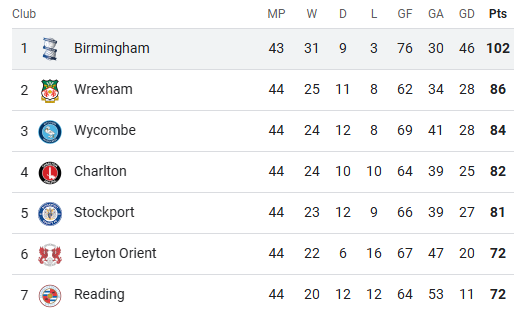 Blackpool’s chances are effectively zero. Huddersfield Town in 9th are out of the playoffs and Bolton Wanderers in 8th have to overcome a 23-goal GD deficit in 2 games to make it, which isn’t going to happen. Thus there are 6 teams vying for the remaining 5 promotion places. Here’s how the top of the table looks: