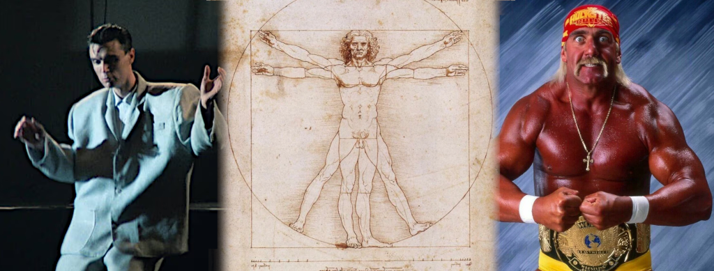 The human body is, in and of itself, an entirely natural object. It cannot be made bigger than it is. Well, perhaps with steroids, but that’s another issue. Regardless of how the body is deployed, it is the same size. It occupies a defined volume of space that cannot be changed. Granted, waving an arm about increases the body’s reach beyond a more normal posture, but still. We’re all Vitruvian Man after all. If we are going to make ourselves unnaturally bigger we need David Byrne’s suit or Hulk Hogan’s supplier.