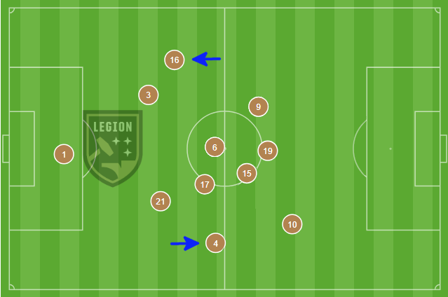 The formation was, at least initially, more of a 4-3-3, and with Enzo at center forward and Juan at left attacking mid, completely inverted from the expected arrangement. Now, obviously having Prosper wide right and Enzo up top worked out brilliantly, but that was just one aspect of the way the Legion played this game. Let’s look first at the team’s average positions (playing left to right):