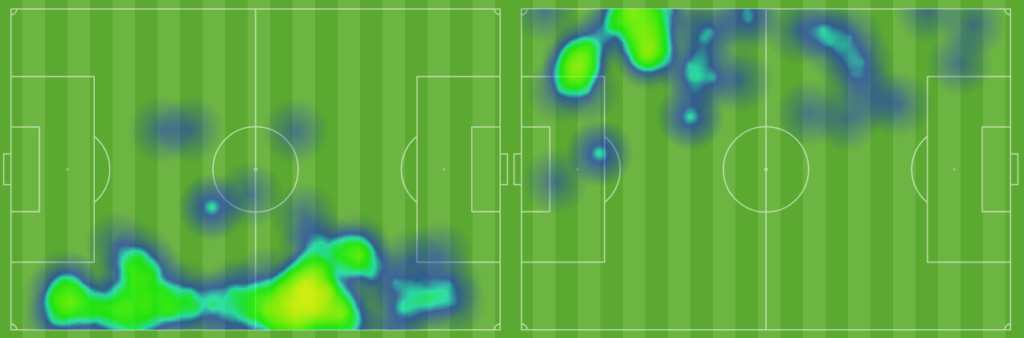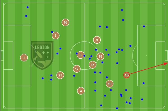 This time we have added Tyler’s personal touchmap, including the one shot he attempted. Clearly, the touches are widely spread around his average position, but mostly ahead of that. Which means that he was constantly wandering. It’s also interesting that a good fraction of his touches were in the right side of the attacking half, such that both the Legion’s lefties were crowding that area.